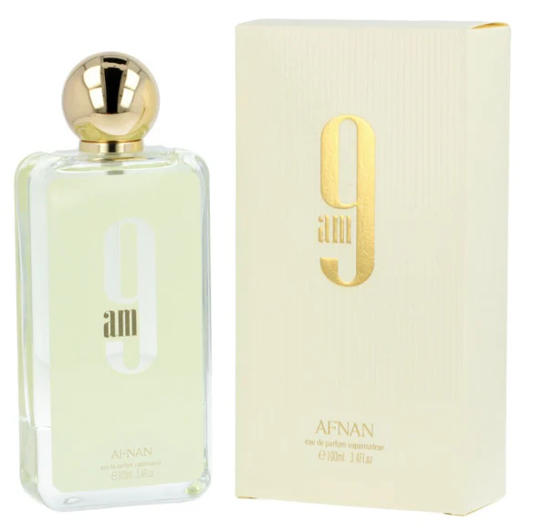 9am de Afnan es una fragancia de la familia olfativa para Mujeres. Las Notas de Salida son limón (lima ácida), mandarina, cardamomo y pimienta rosa; las Notas de Corazón son lavanda, manzana verde, flor de azahar del naranjo y rosa; las Notas de Fondo son almizcle, musgo, cedro y pachulí.