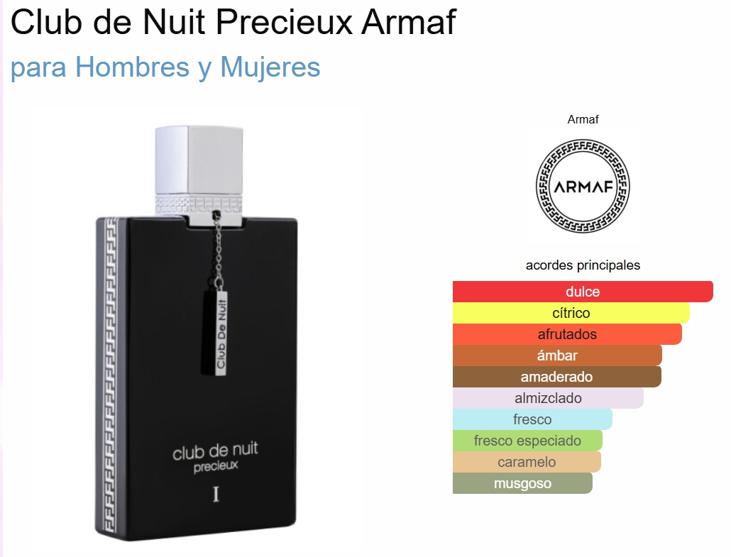 Club de Nuit Precieux de Armaf es una fragancia de la familia olfativa Oriental Amaderada para Hombres y Mujeres. Esta fragrancia es nueva. Club de Nuit Precieux se lanzó en 2024. Las Notas de Salida son piña, limón (lima ácida), caramelo, bergamota, pera, pimienta rosa y pimienta negra; las Notas de Corazón son musgo de roble, madera blanca, anís, jazmín y lirio de los valles (muguete); las Notas de Fondo son ambroxan, vainilla, ámbar, almizcle blanco, cuero, pachulí y cedro.