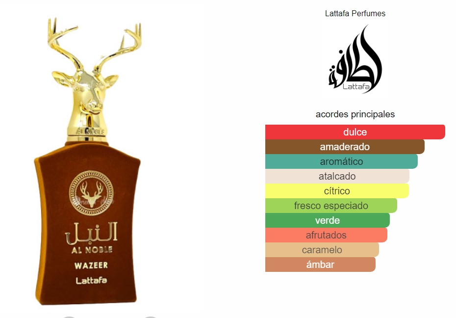 Wazeer de Lattafa Perfumes es una fragancia de la familia olfativa para Hombres y Mujeres. Las Notas de Salida son menta, naranja, bergamota y enebro de Virginia; las Notas de Corazón son chocolate, caramelo, pera, iris y frambuesa; las Notas de Fondo son ámbar, vainilla, almizcle, sándalo, cedro y vetiver.